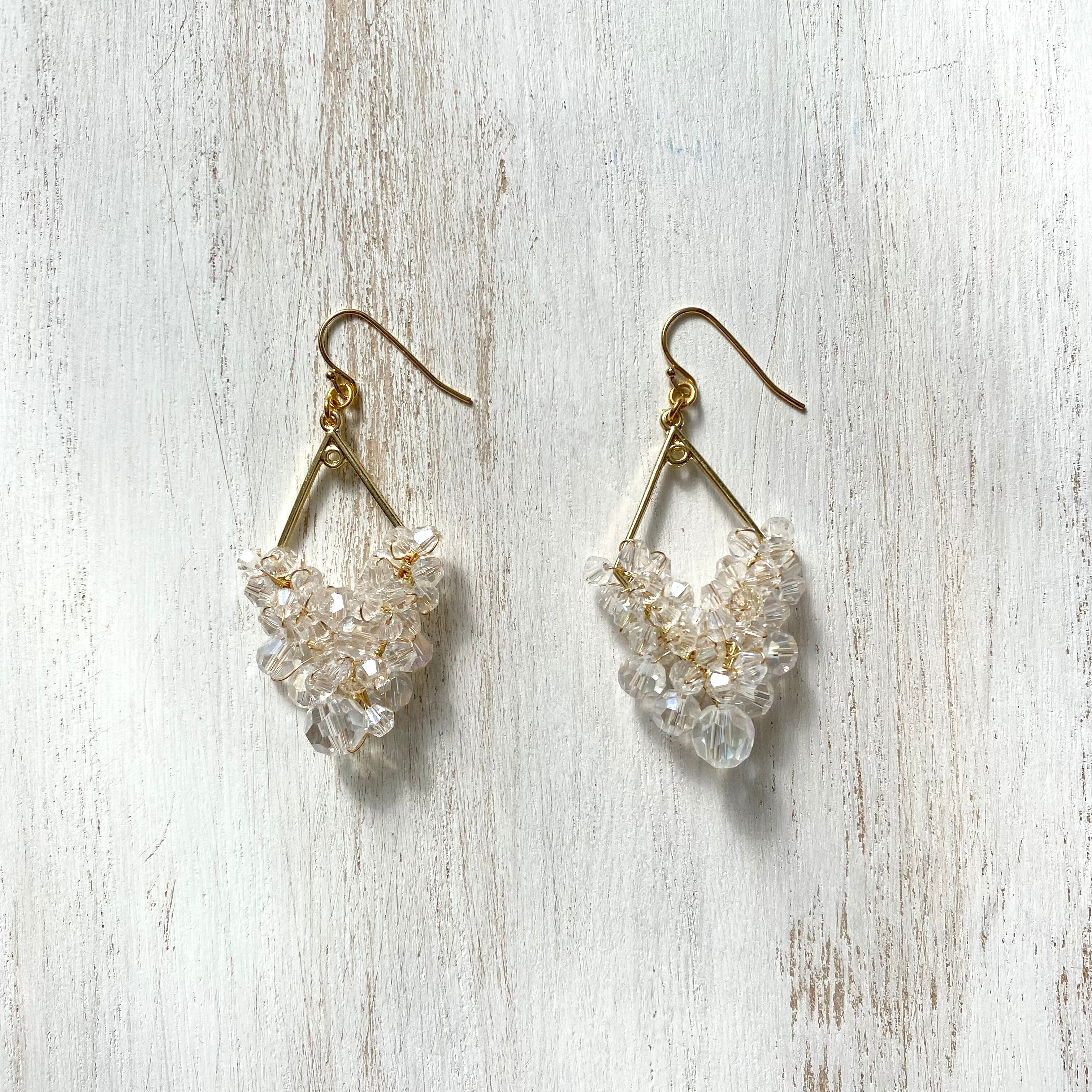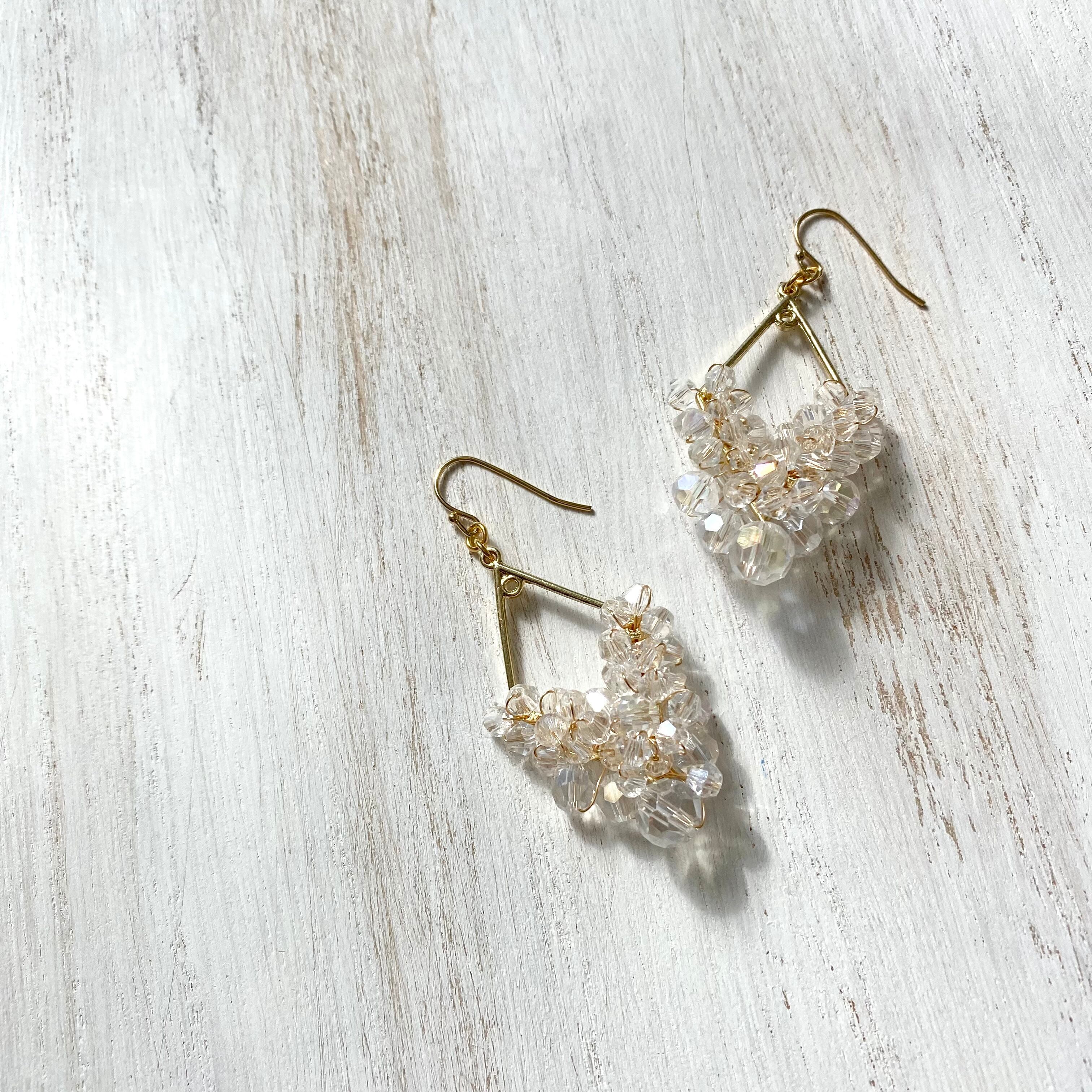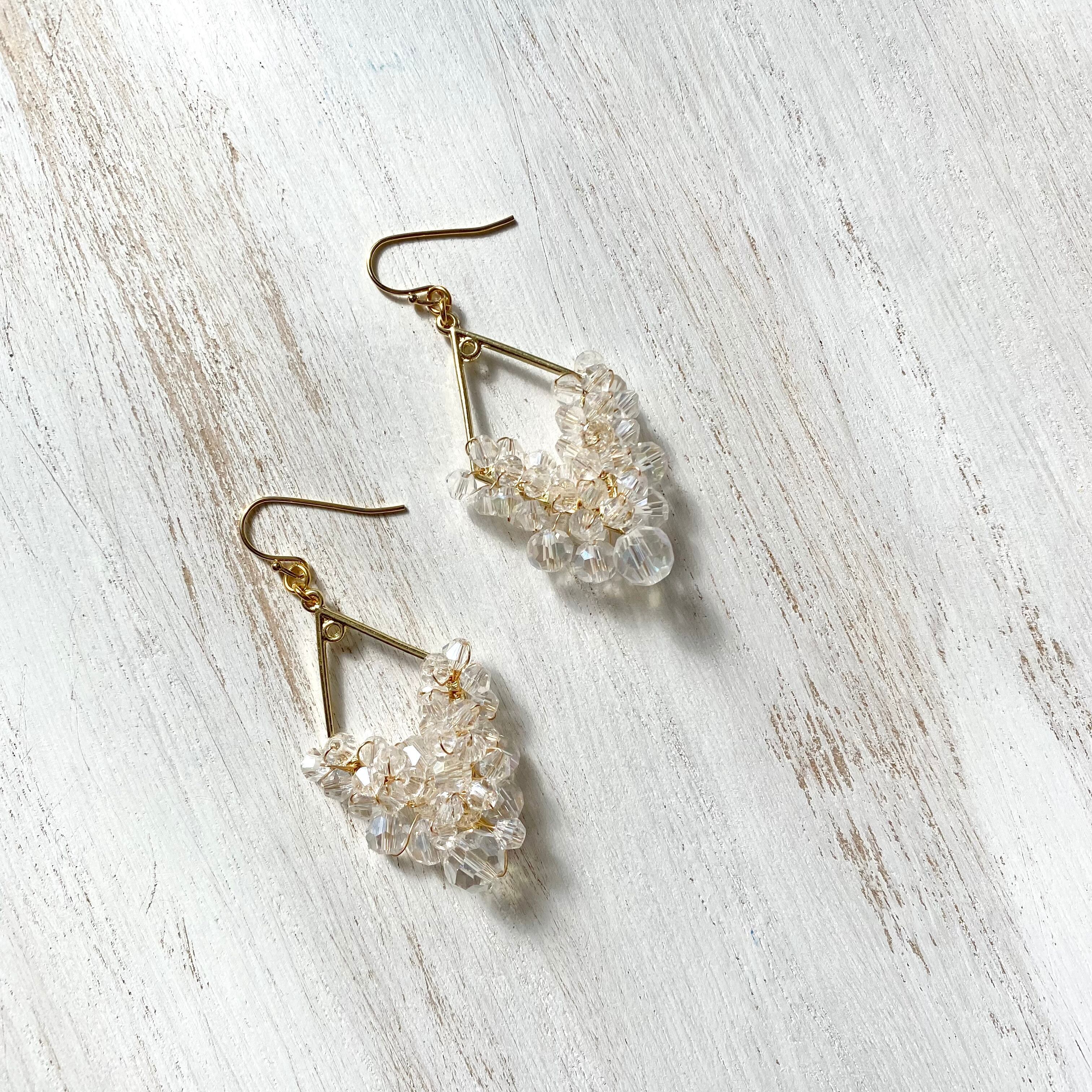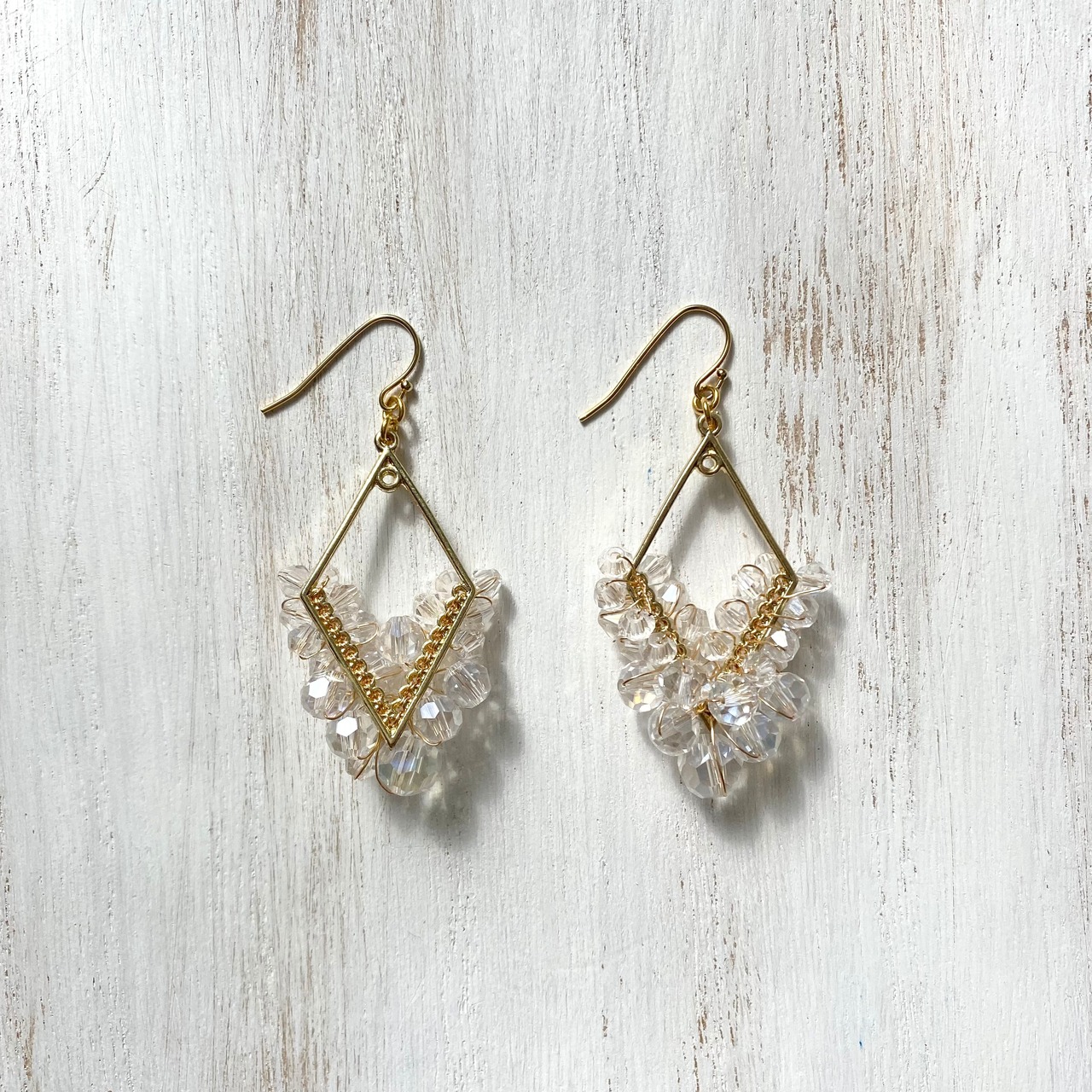 ●ゴールドのダイヤ型フープにクリアビーズを巻き付けたデザインのピアス