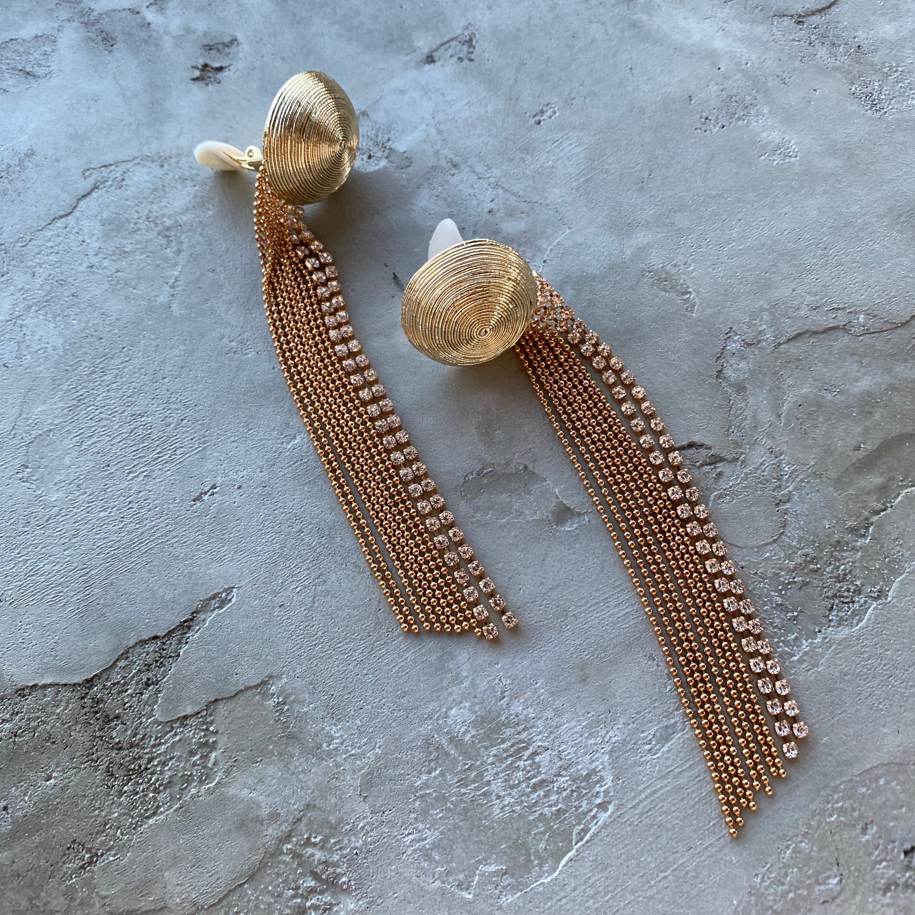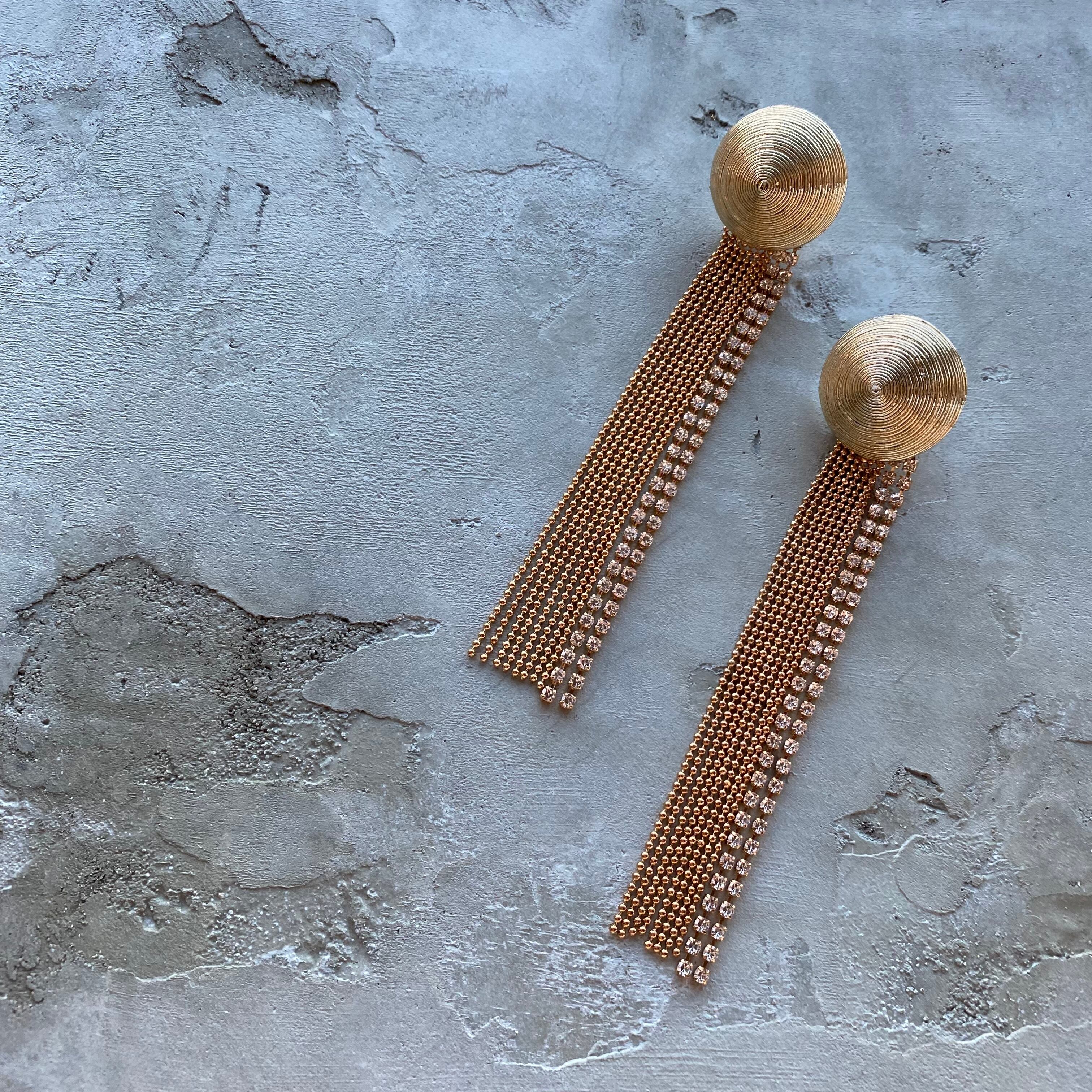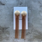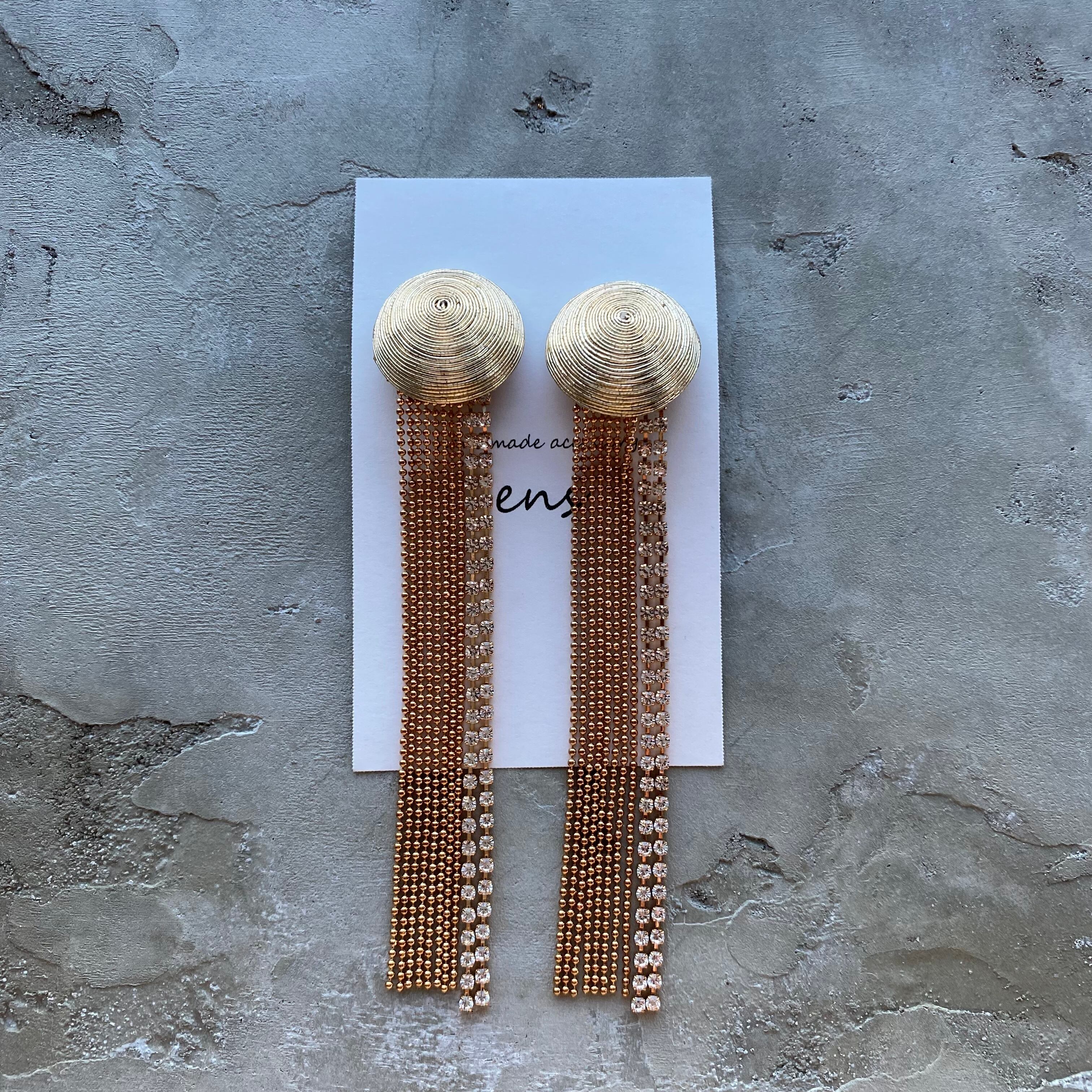 ●糸巻きカボションにロングラインストーンチェーンタッセルが揺れる華やかなデザインのイヤリング