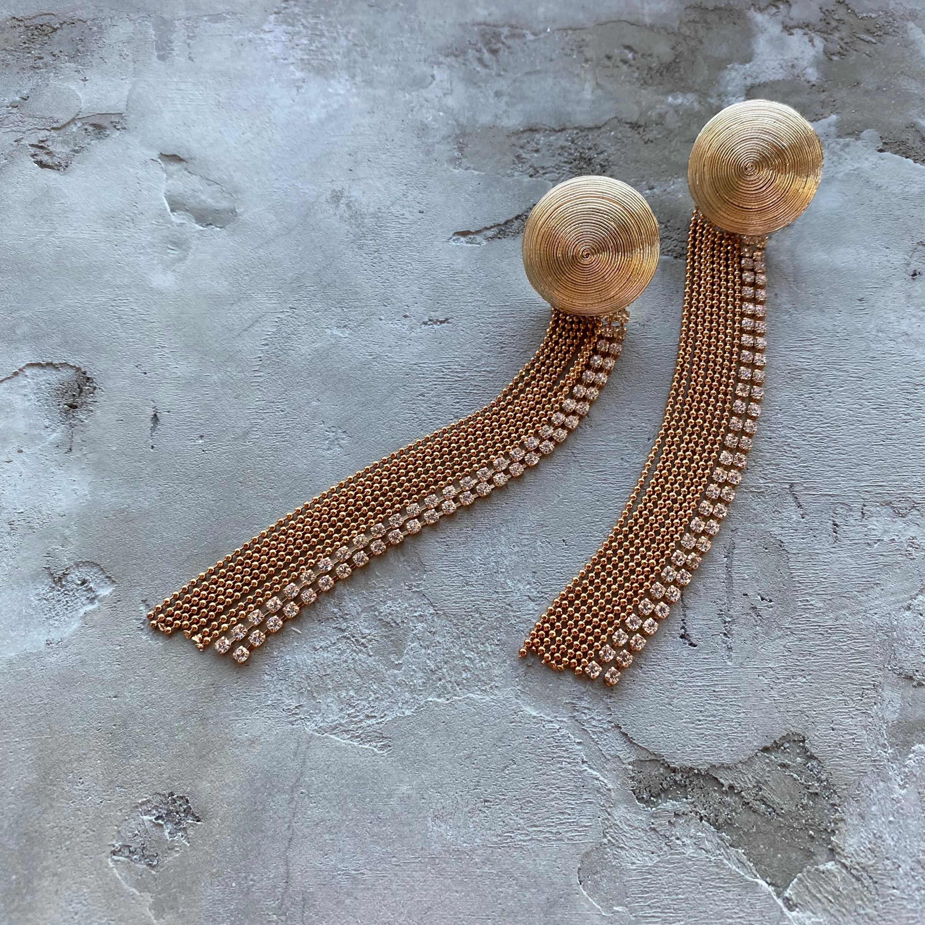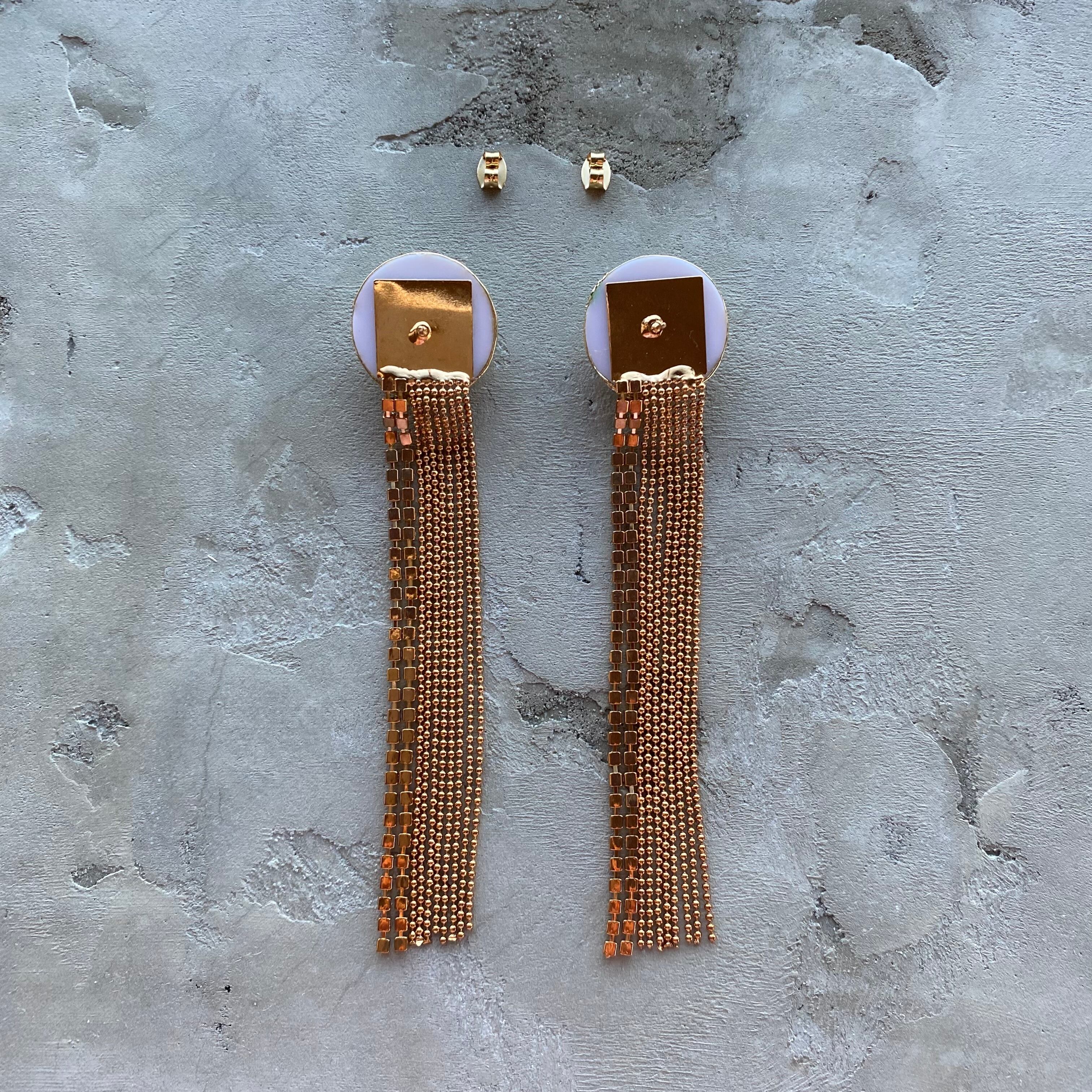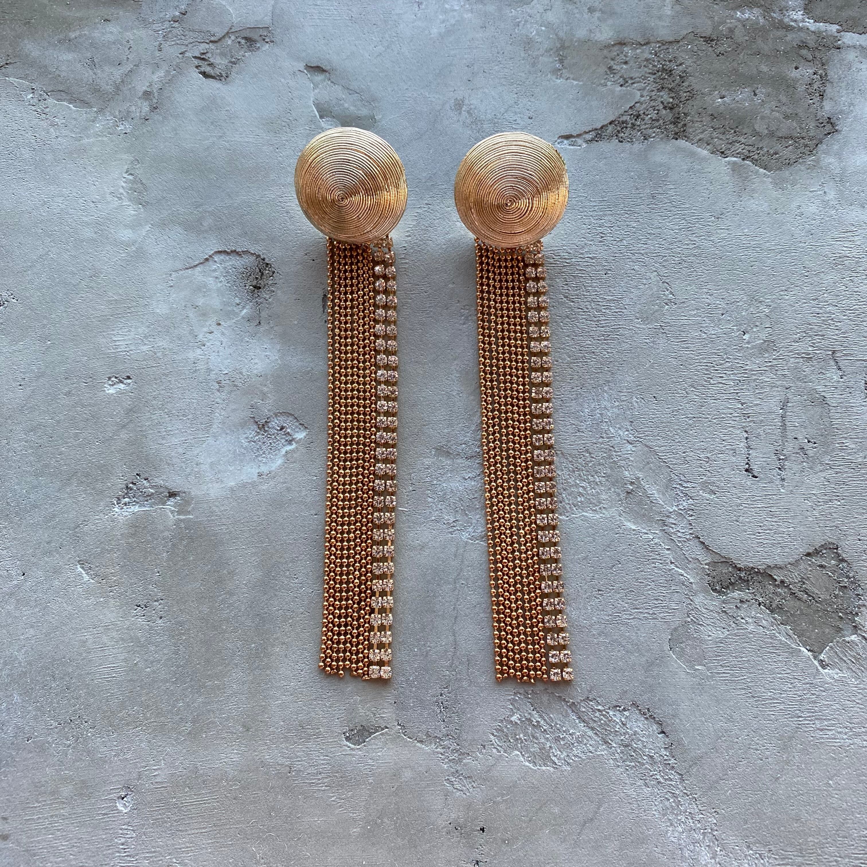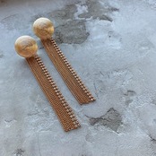 ●糸巻きカボションにロングラインストーンチェーンタッセルが揺れる華やかなデザインのピアス