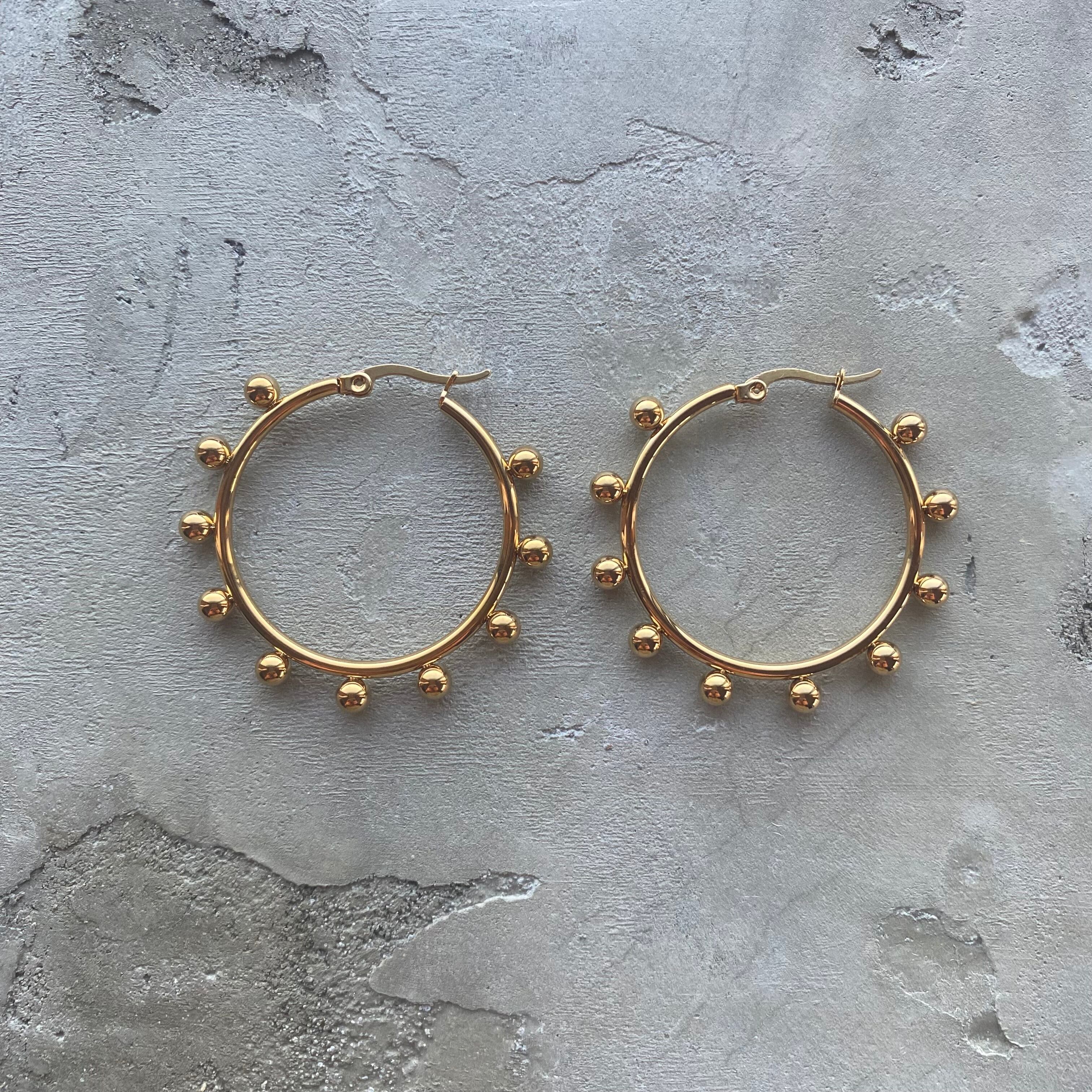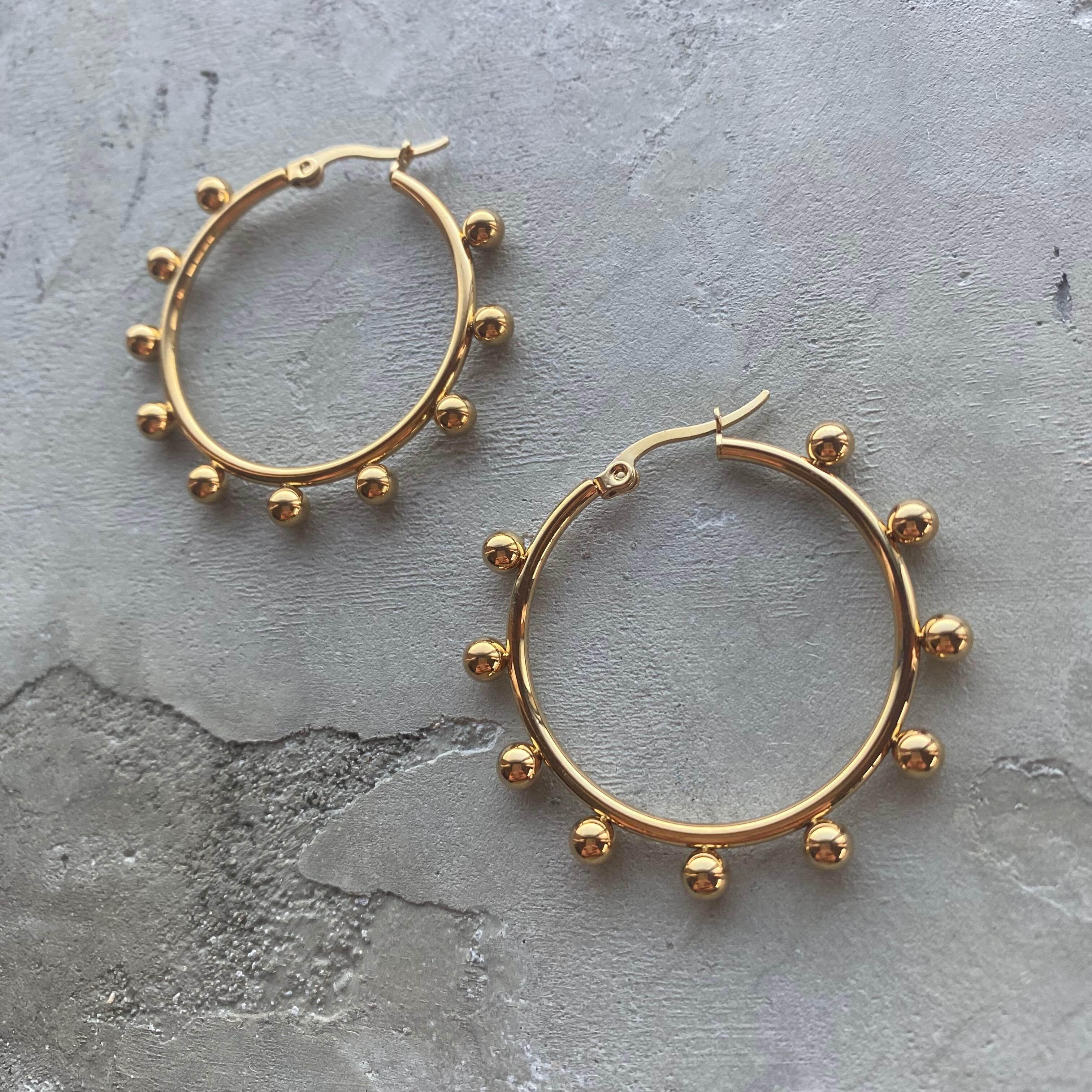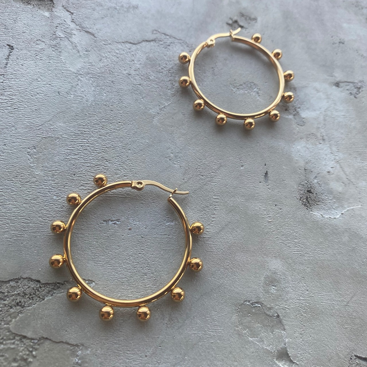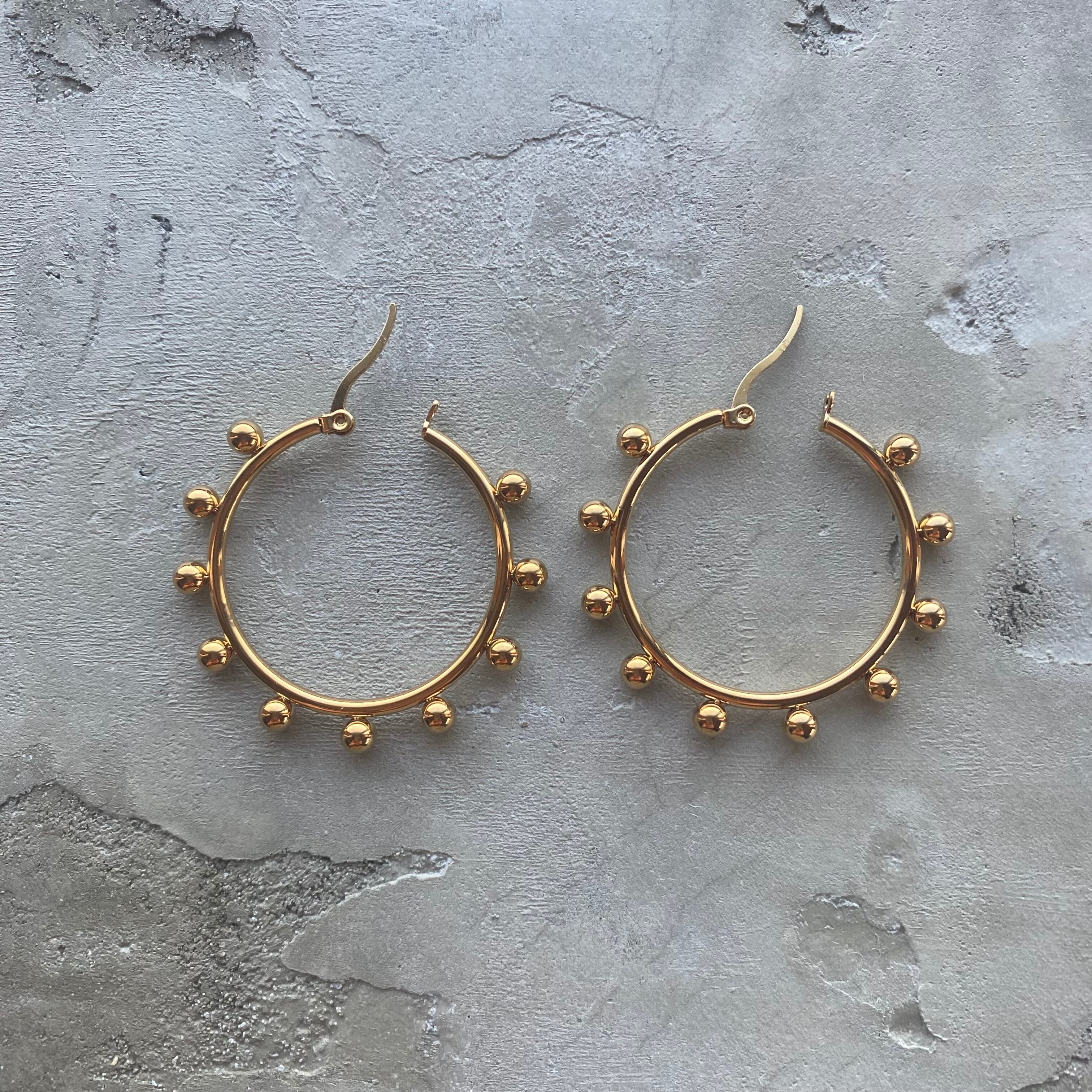 つぶつぶが散りばめられた個性的なデザインのゴールドリングピアス