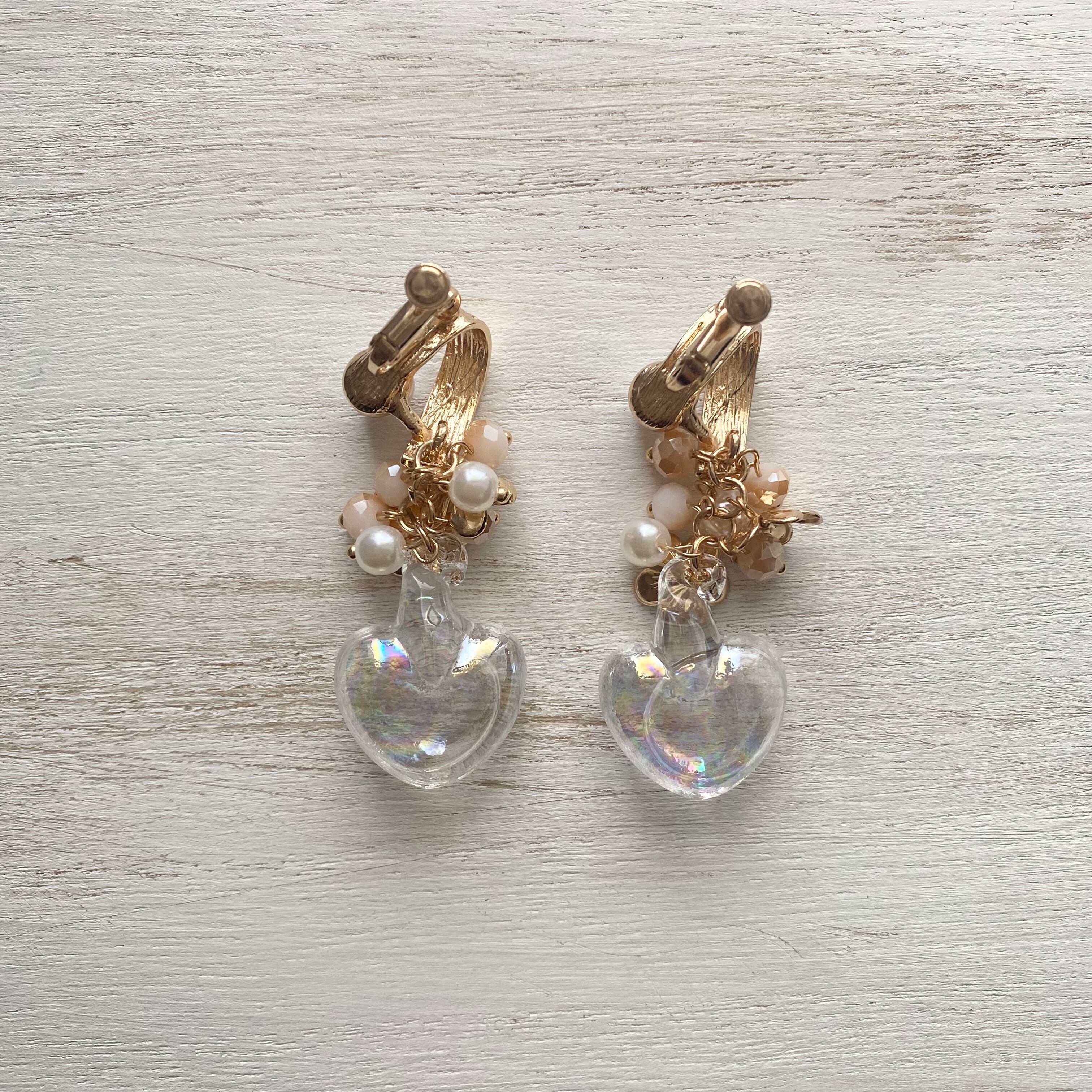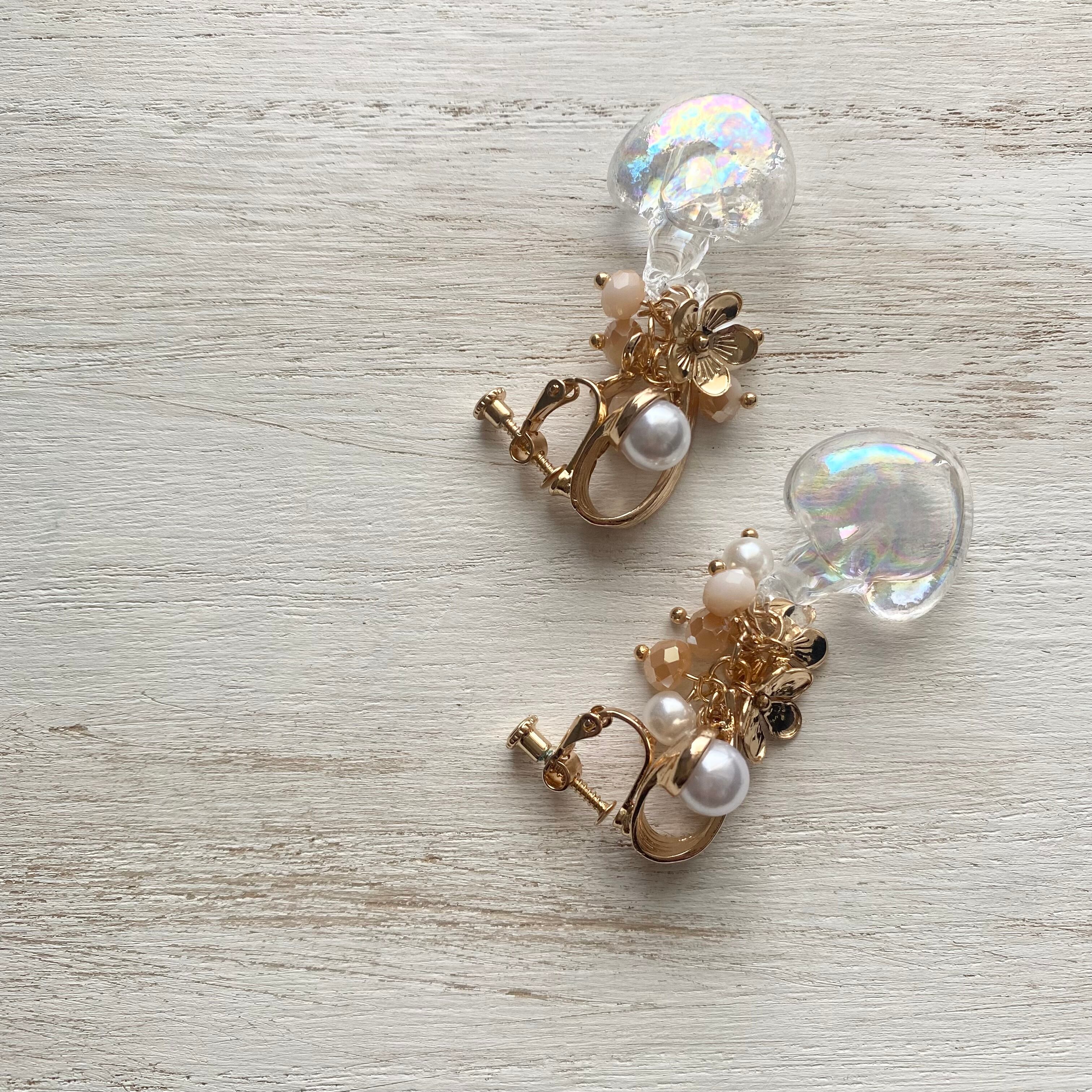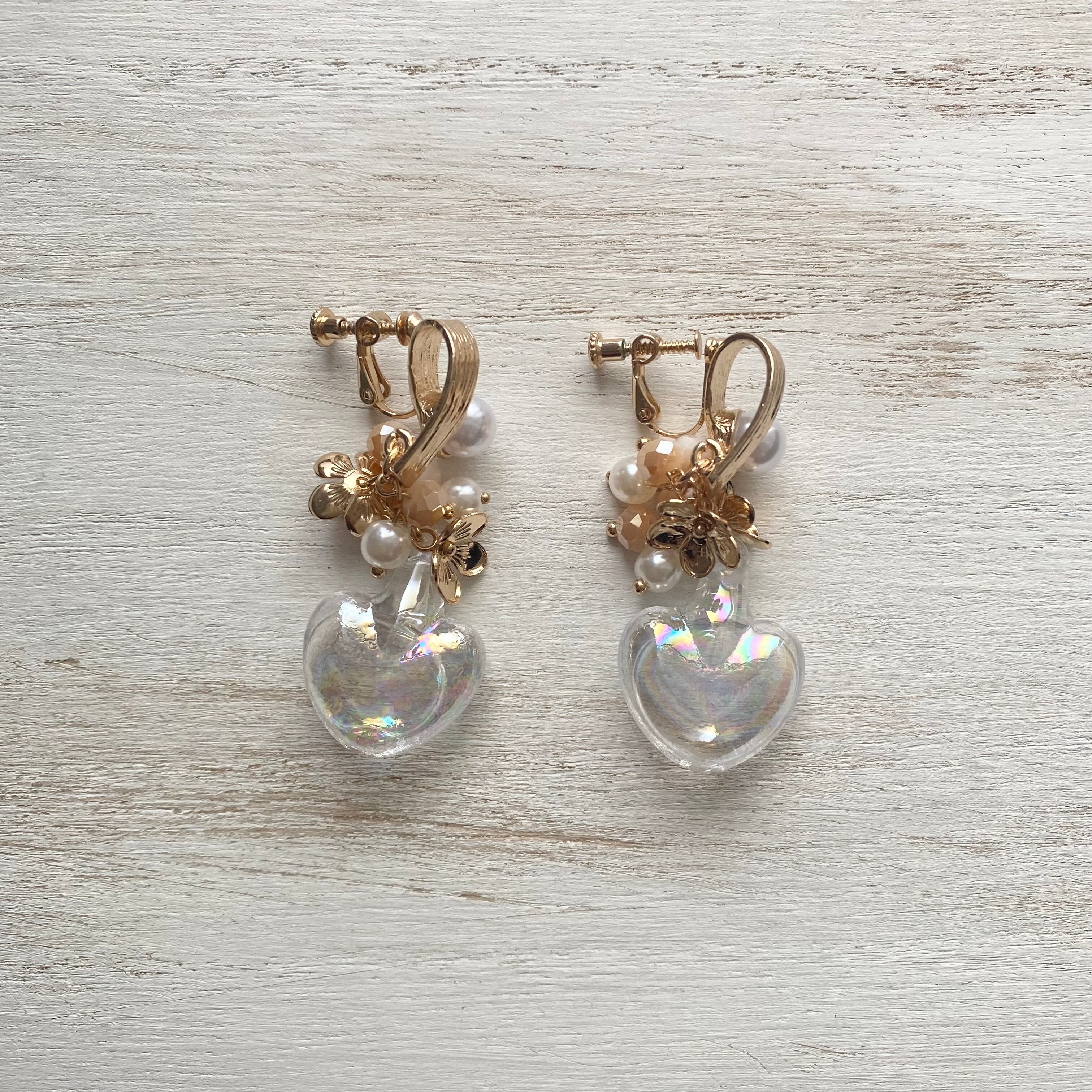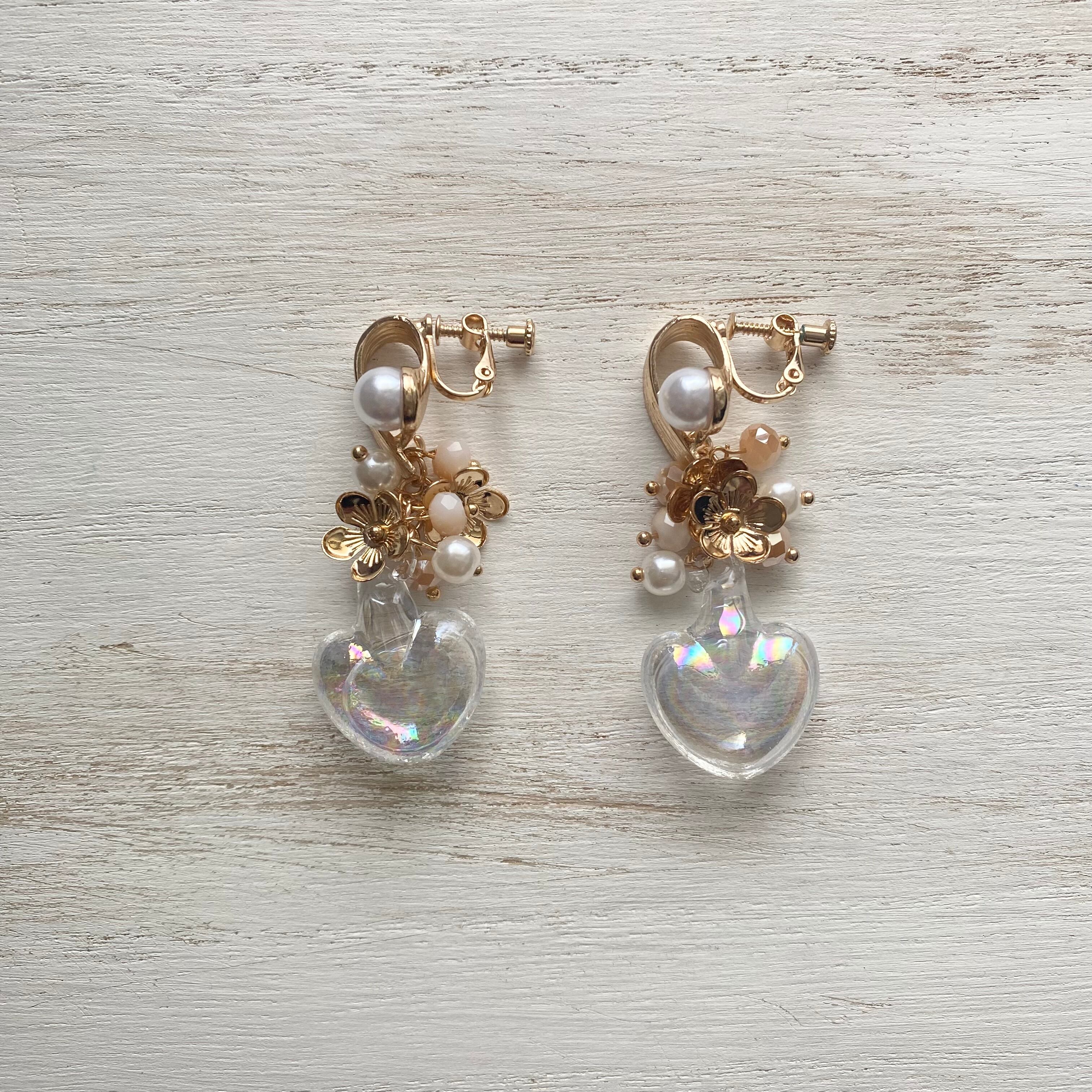 ●パール付きのゴールドのデザインイヤリング金具に水入りのオーロラハートガラスパーツとパール・ビーズ・フラワーチャームを合わせたイヤリング