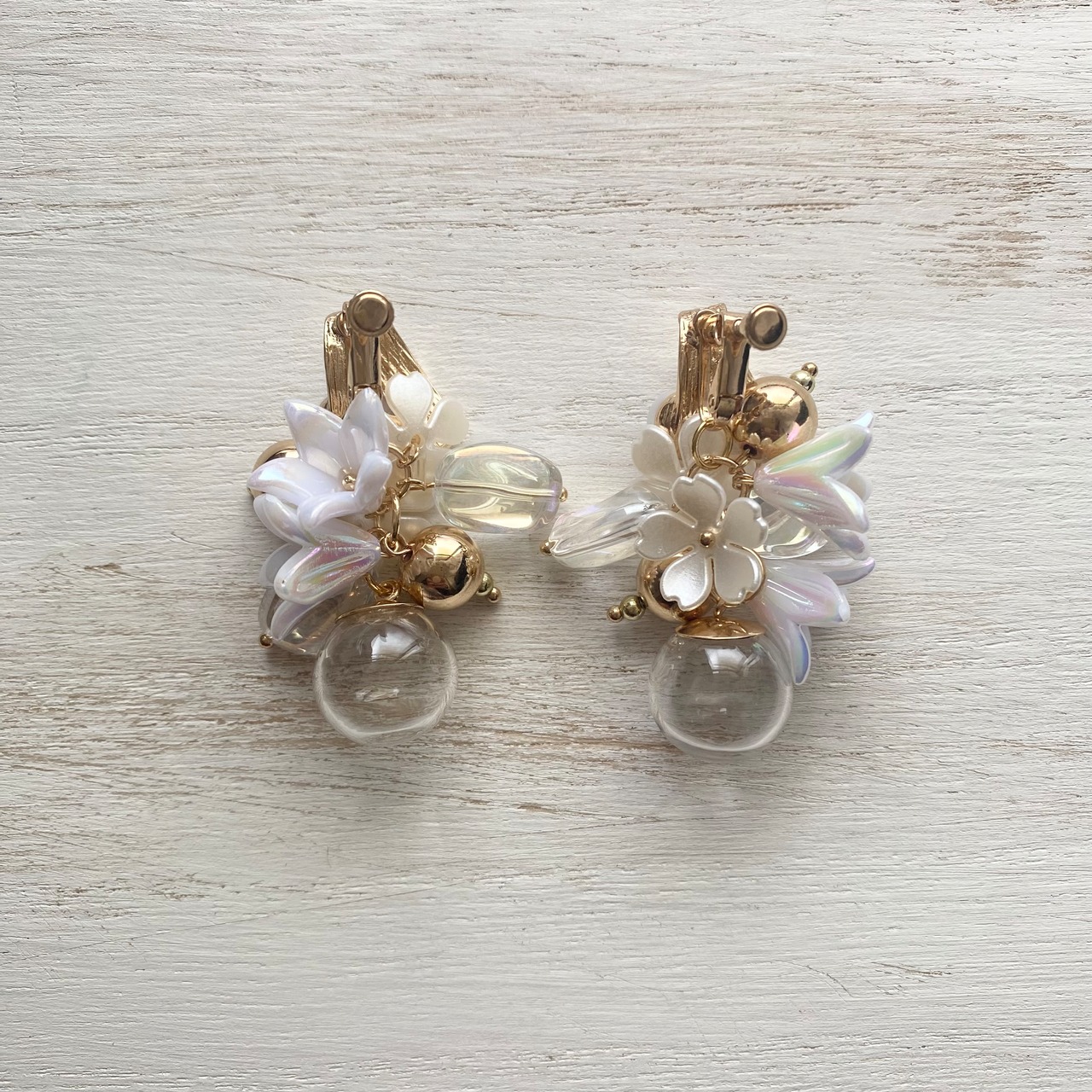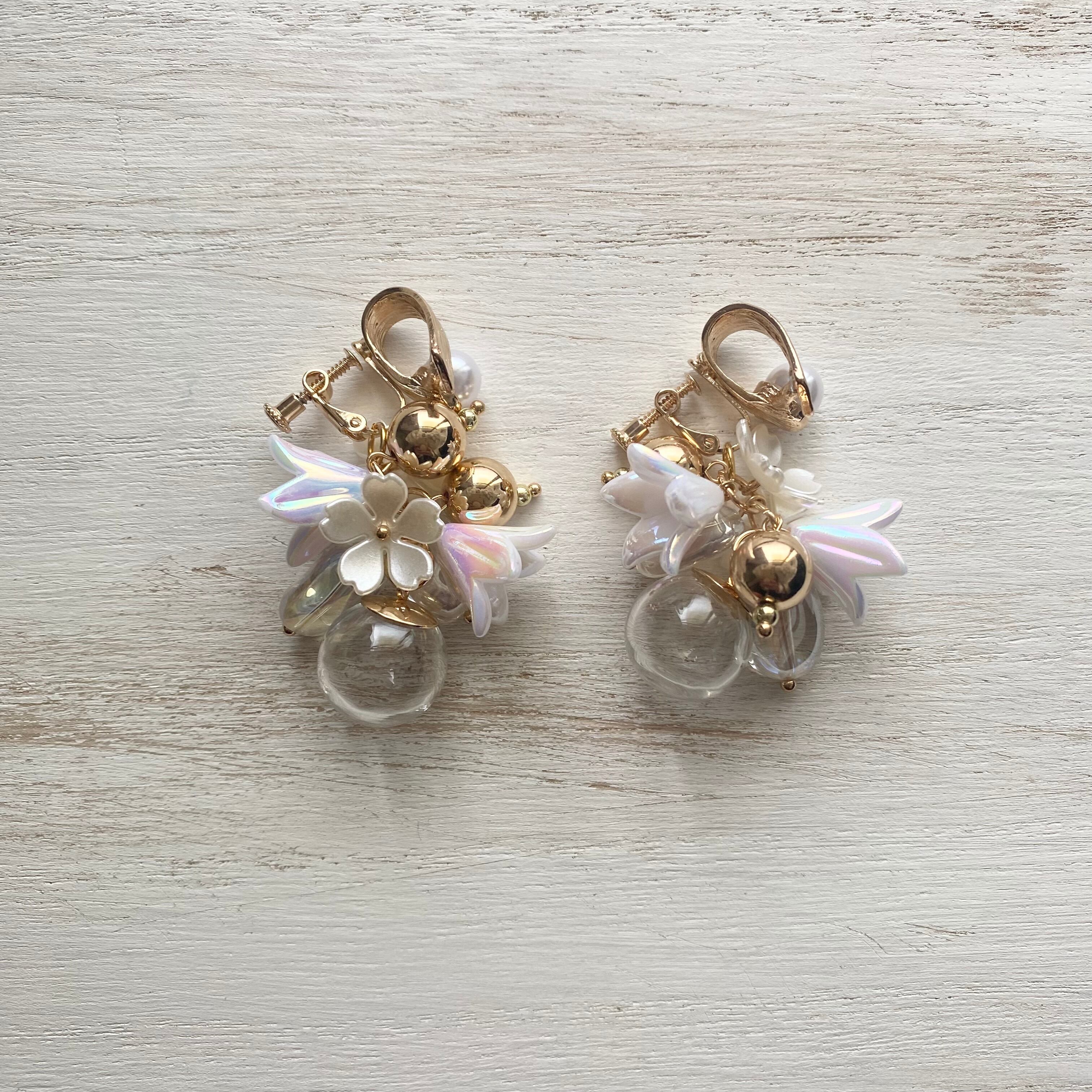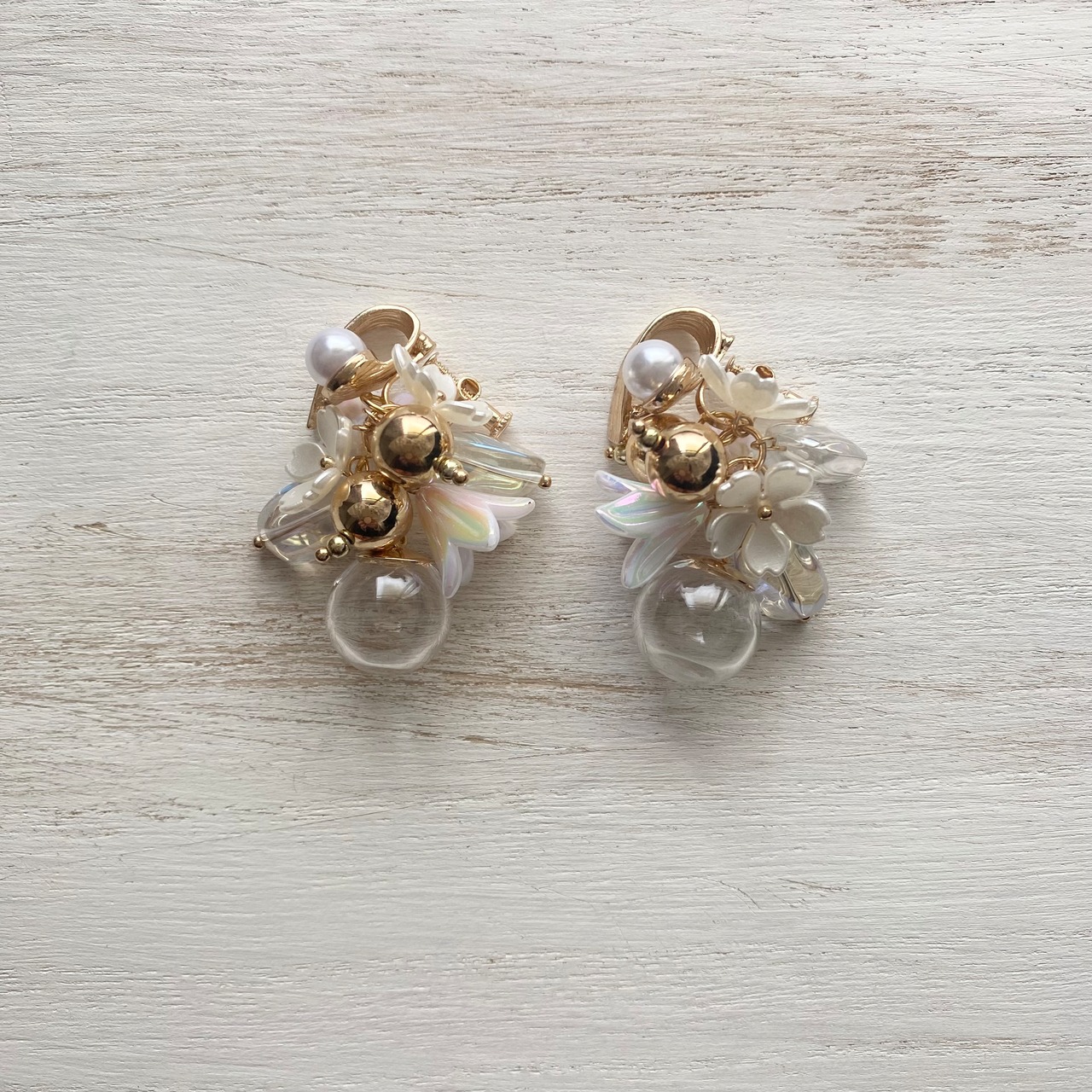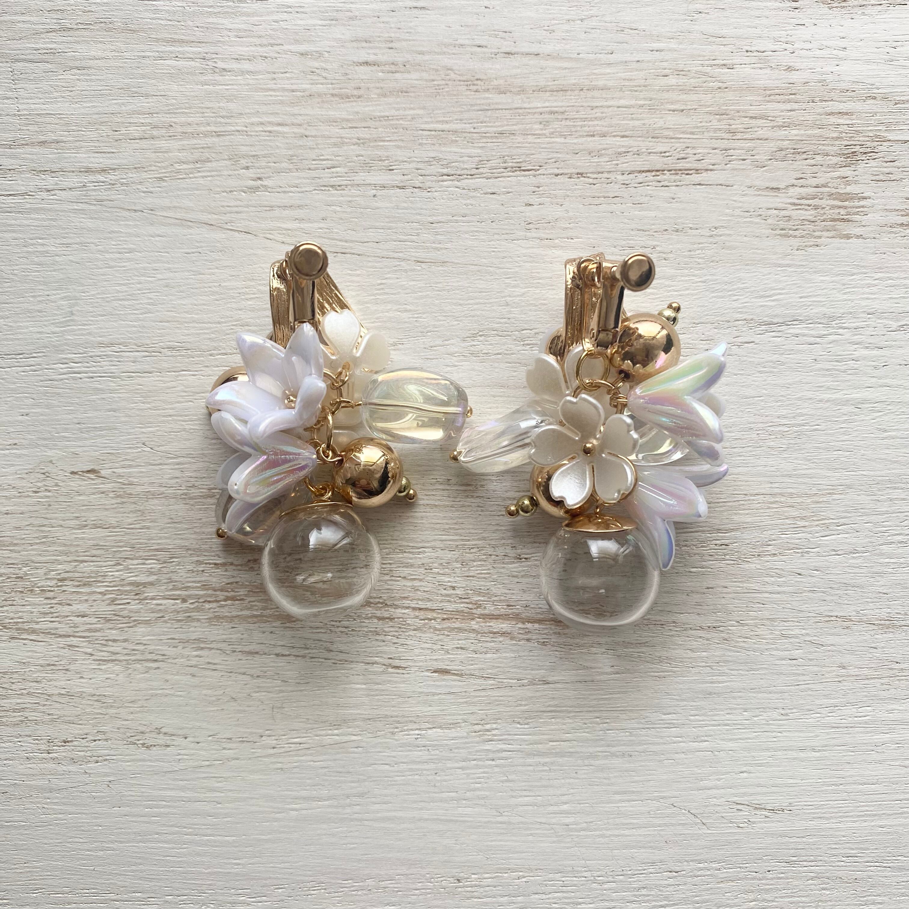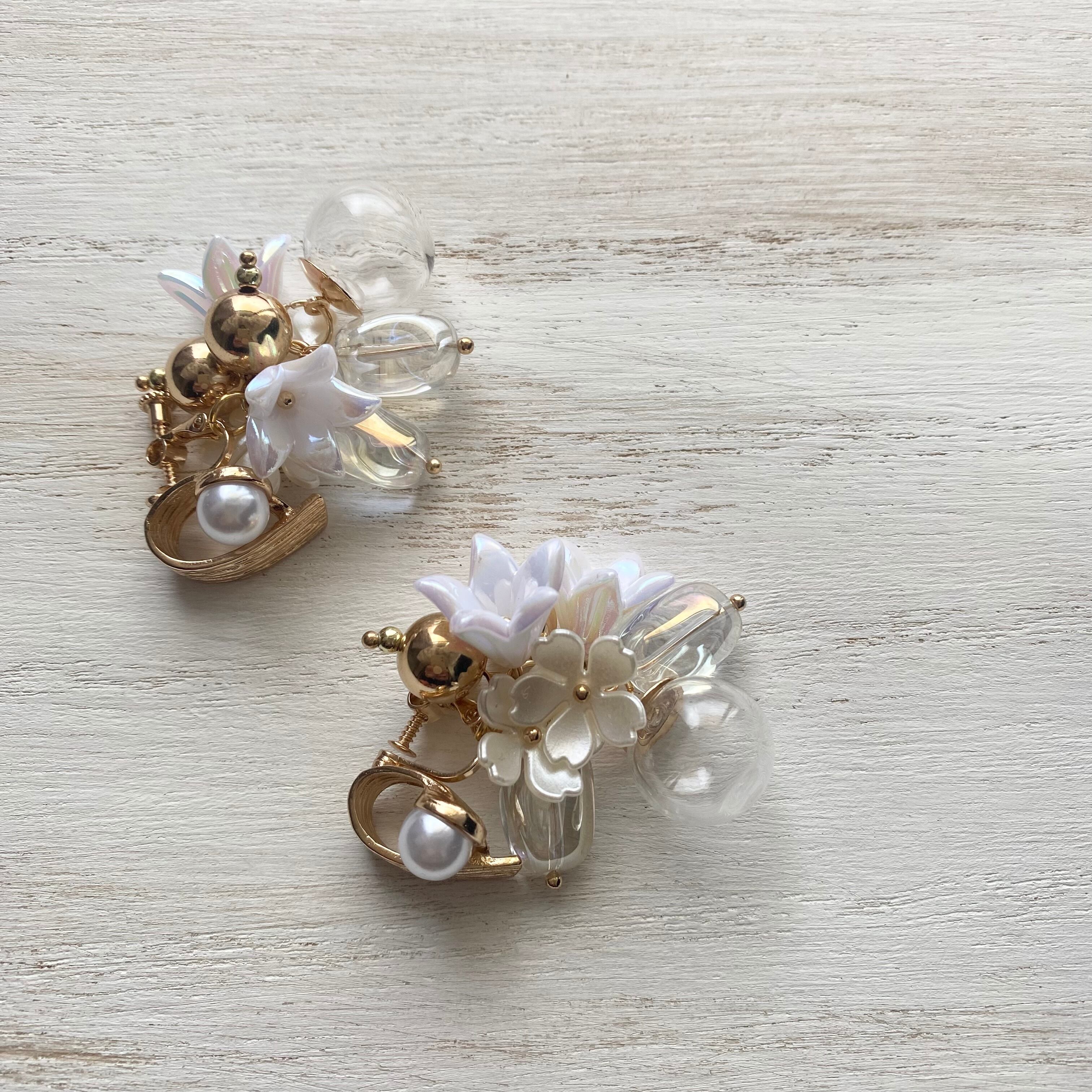 ●パール付きのゴールドのデザインイヤリング金具にガラスボールとゴールド・クリアビーズ・パールフラワーチャームを合わせたイヤリング