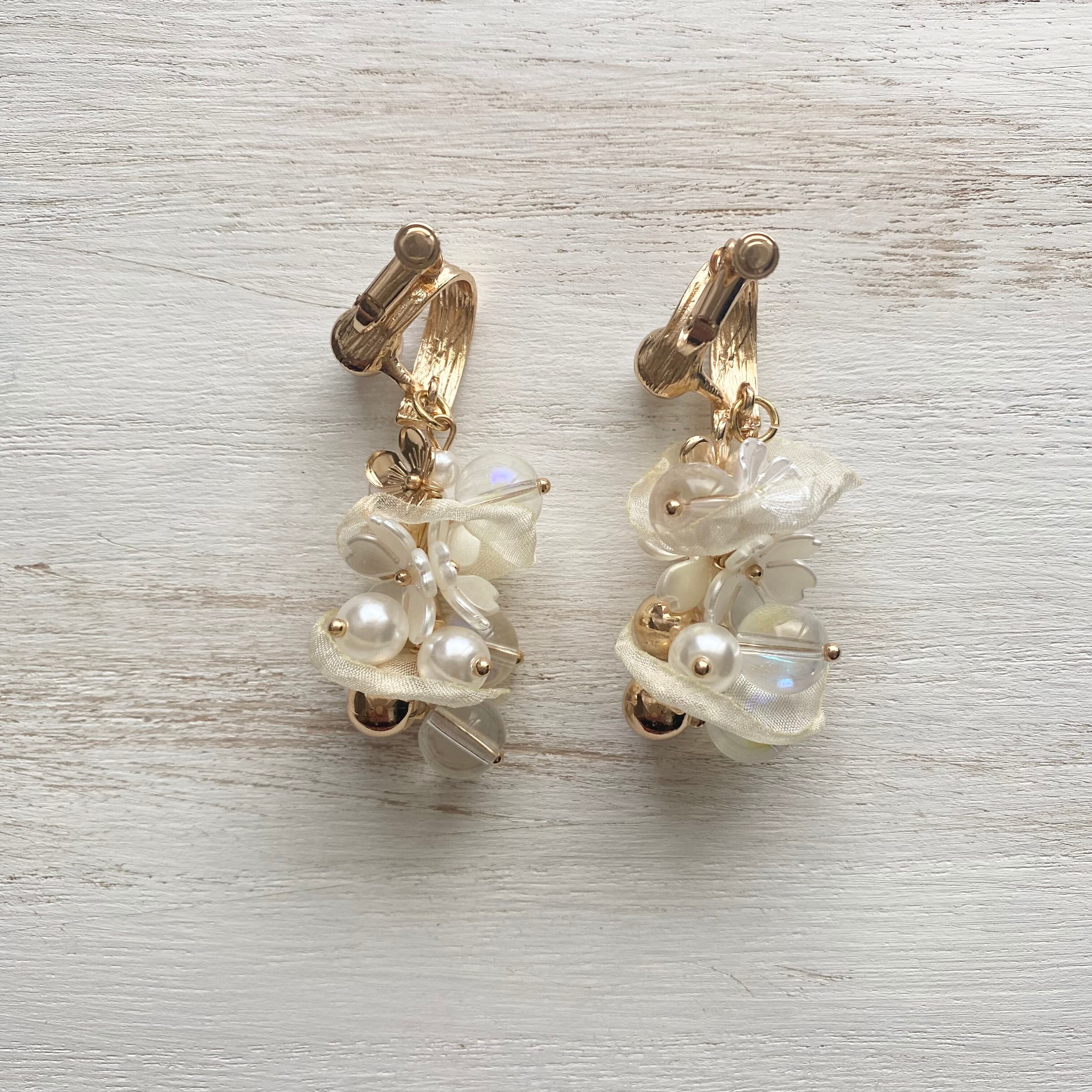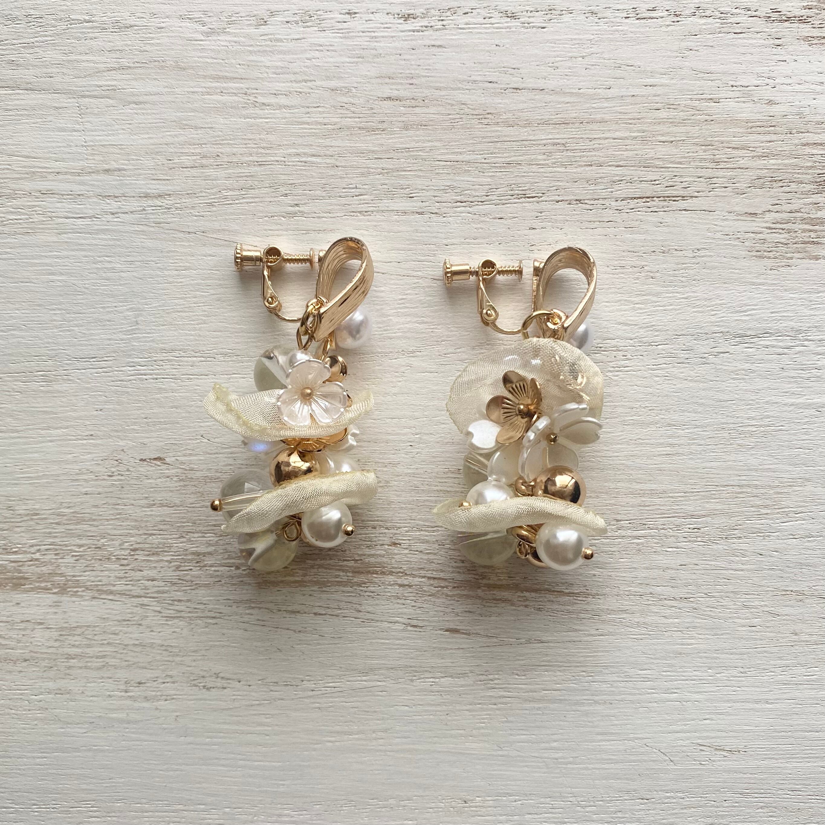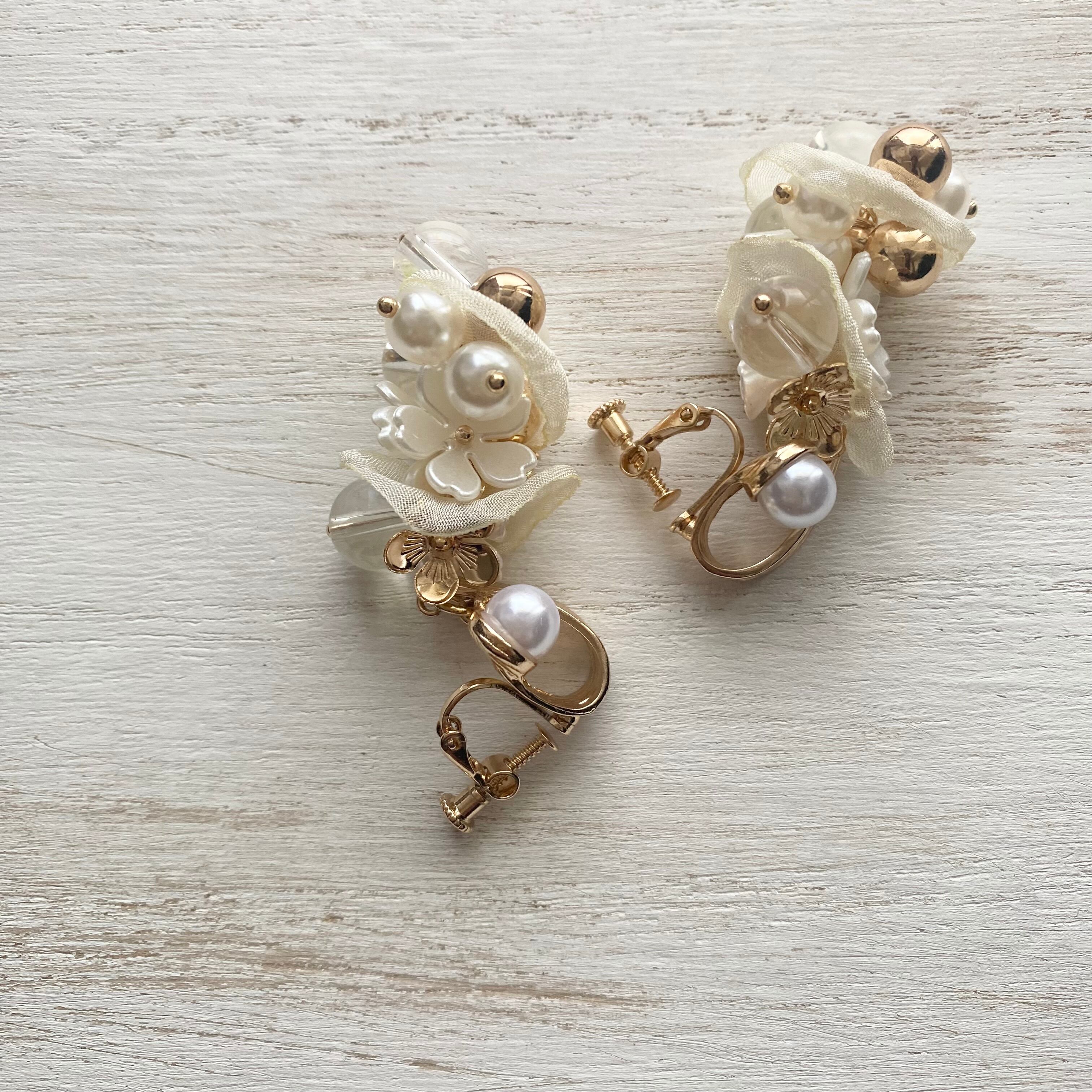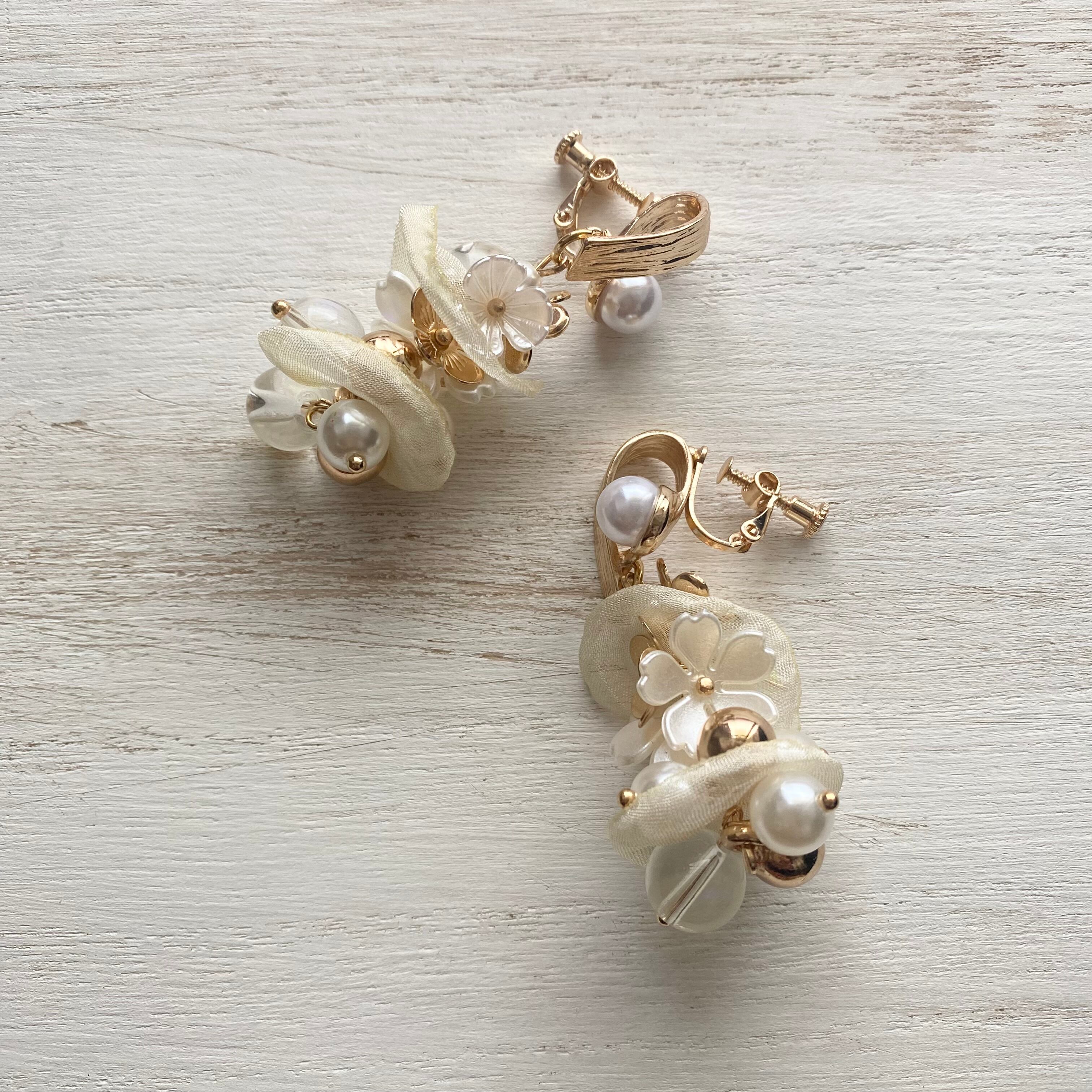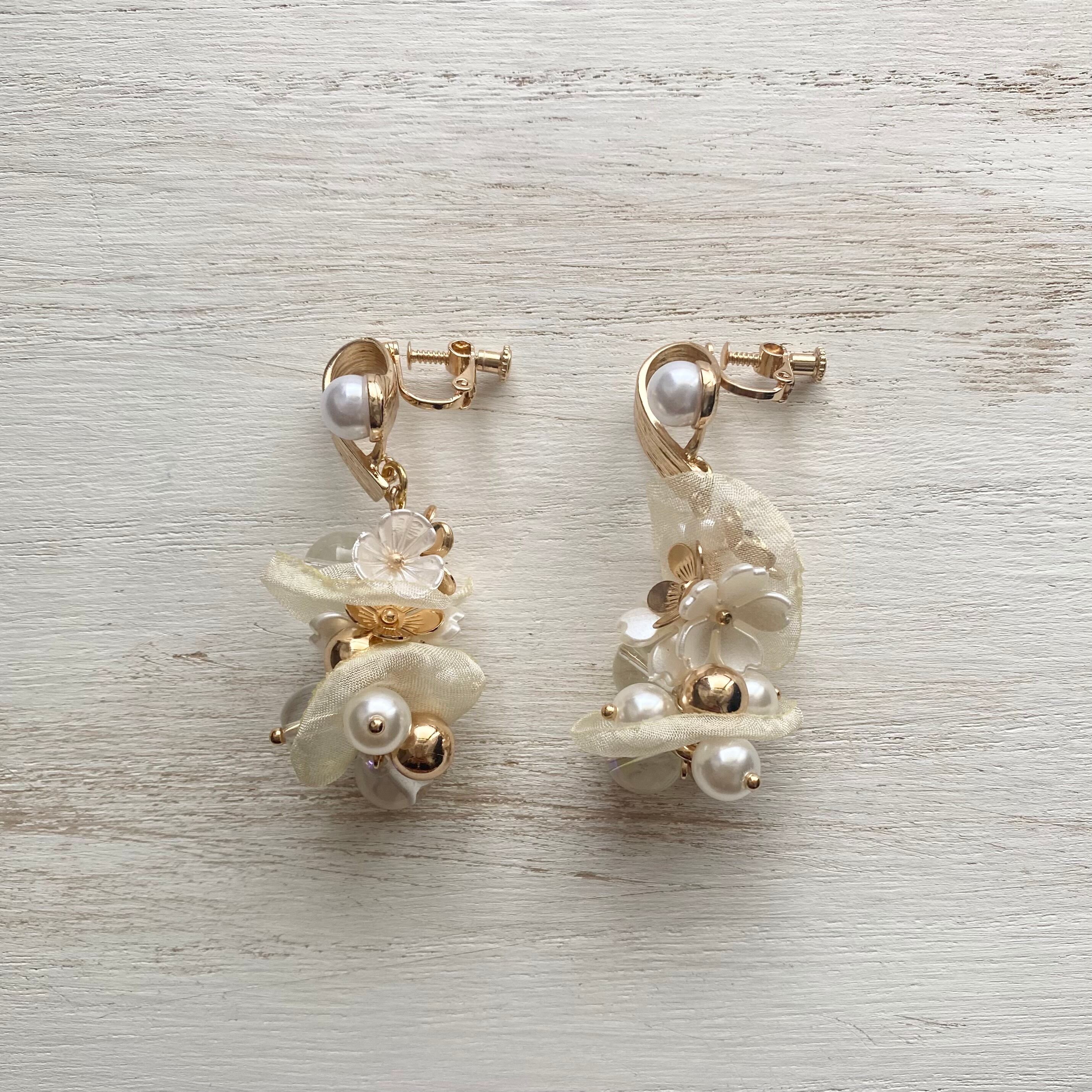 ●パール付きのゴールドのデザインイヤリング金具にオフホワイトのシフォンとパール・ゴールド・クリアビーズ・ゴールド・パールフラワータッセルを合わせたイヤリング